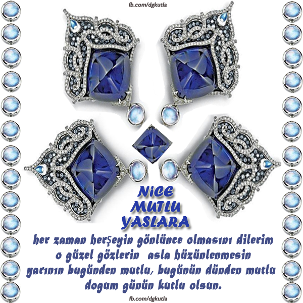 Doğum Günü Kartlar Mücevherli doğum günü kutlama kartı Mücevherli doğum günü kutlama kartı 26 Her zaman herşeyin gönlünce olmasını dilerim o güzel gözlerin asla hüzünlenmesin yarının bugünden mutlu bugünün dünden mutlu doğum günün kutlu olsun.NİCE MUTLU YAŞLARA.. Mücevherli doğum günü kutlama kartı Yorum Yap Paylaş Haberle ilgili daha fazlası:# elmas